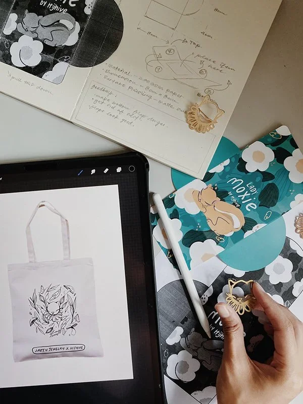 Lady Moxie cultivates around the idea of representing women of strength while pursuing their own version of happiness. Facing each obstacle as a form of growth and power. Accompanied with the brooch, this collaboration includes a sticker set and a tote-bag to complete a full collection.